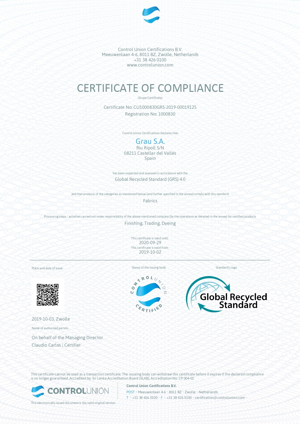 Following the process of improvement and adaptation to the demands of the markets, Grau, S.A. has obtained, after the appropiate audit, the GRS certification (Global Recycled Standard).